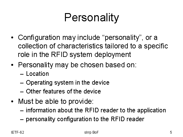 Personality Configuration may include “personality”, or a collection of characteristics tailored to a specific role in the RFID system deployment Personality may be chosen based on: Location Operating system in the device Other features of the device Must be able to provide: information about the RFID reader to the application personality configuration to the RFID reader |
