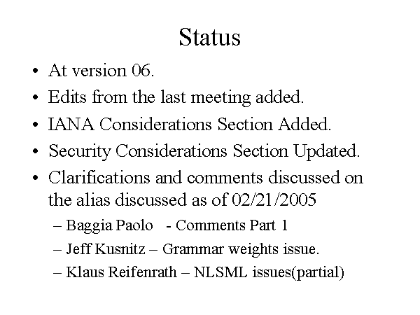 Status At version 06. Edits from the last meeting added. IANA Considerations Section Added. Security Considerations Section Updated. Clarifications and comments discussed on the alias discussed as of 02/21/2005 Baggia Paolo - Comments Part 1 Jeff Kusnitz – Grammar weights issue. Klaus Reifenrath – NLSML issues(partial) |