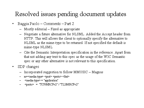 Resolved issues pending document updates Baggia Paolo – Comments – Part 2 Mostly editorial – Fixed as appropriate Negotiate a future alternative for NLSML. Added the Accept header from HTTP. This will allows the client to optionally specify the alternative to NLSML as the mime-type to be returned. If not specified the default is mime-type NLSML Cite the Semantic Interpretation specification in the reference. Apart from that not adding any text to this spec as the usage of the W3C Semantic spec or any other alternative is not relevant to this specification. SDP changes Incorporated suggestion to follow MMUSIC – Magnus m= |