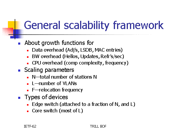 General scalability framework About growth functions for Data overhead (Adj’s, LSDB, MAC entries) BW overhead (Hellos, Updates, Refr’s/sec) CPU overhead (comp complexity, frequency) Scaling parameters N—total number of stations N L—number of VLANs F—relocation frequency Types of devices Edge switch (attached to a fraction of N, and L) Core switch (most of L) |