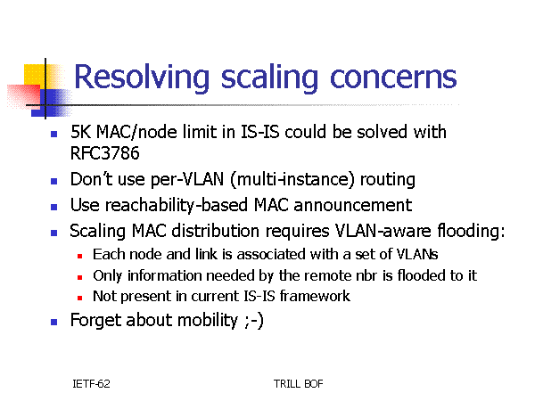 Resolving scaling concerns 5K MAC/node limit in IS-IS could be solved with RFC3786 Don’t use per-VLAN (multi-instance) routing Use reachability-based MAC announcement Scaling MAC distribution requires VLAN-aware flooding: Each node and link is associated with a set of VLANs Only information needed by the remote nbr is flooded to it Not present in current IS-IS framework Forget about mobility ;-) |
