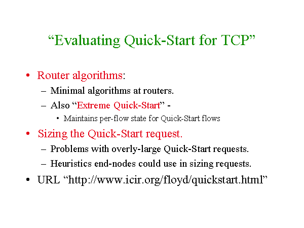 “Evaluating Quick-Start for TCP” Router algorithms: Minimal algorithms at routers. Also “Extreme Quick-Start” - Maintains per-flow state for Quick-Start flows Sizing the Quick-Start request. Problems with overly-large Quick-Start requests. Heuristics end-nodes could use in sizing requests. URL “http://www.icir.org/floyd/quickstart.html” |