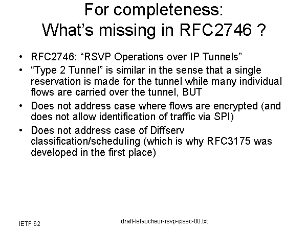 For completeness:What’s missing in RFC2746 ? RFC2746: “RSVP Operations over IP Tunnels” “Type 2 Tunnel” is similar in the sense that a single reservation is made for the tunnel while many individual flows are carried over the tunnel, BUT Does not address case where flows are encrypted (and does not allow identification of traffic via SPI) Does not address case of Diffserv classification/scheduling (which is why RFC3175 was developed in the first place) |