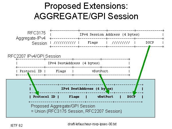 Proposed Extensions:AGGREGATE/GPI Session +-------------+-------------+-------------+-------------+ | IPv4 Session Address (4 bytes) | +-------------+-------------+-------------+-------------+ | /////////// | Flags | ///////// | DSCP | +-------------+-------------+-------------+-------------+ +-------------+-------------+-------------+-------------+ | IPv4 DestAddress (4 bytes) | +-------------+-------------+-------------+-------------+ | Protocol ID | Flags | vDstPort | +-------------+-------------+-------------+-------------+ +-------------+-------------+-------------+-------------+ | IPv4 DestAddress (4 bytes) | +-------------+-------------+-------------+-------------+ | Protocol ID | Flags | vDstPort | DSCP | +-------------+-------------+-------------+-------------+ RFC3175 Aggregate-IPv4 Session RFC2207 IPv4/GPI Session Proposed Aggregate/GPI Session = Union (RFC3175 Session, RFC2207 Session) |