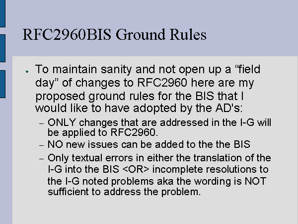 RFC2960BIS Ground Rules To maintain sanity and not open up a “field day” of changes to RFC2960 here are my proposed ground rules for the BIS that I would like to have adopted by the AD's: ONLY changes that are addressed in the I-G will be applied to RFC2960. NO new issues can be added to the the BIS Only textual errors in either the translation of the I-G into the BIS |