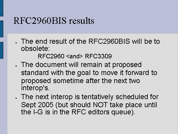 RFC2960BIS results The end result of the RFC2960BIS will be to obsolete: RFC2960 The document will remain at proposed standard with the goal to move it forward to proposed sometime after the next two interop's. The next interop is tentatively scheduled for Sept 2005 (but should NOT take place until the I-G is in the RFC editors queue). |