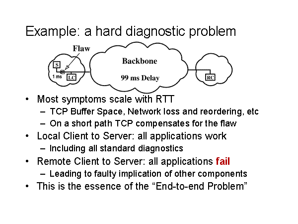 Example: a hard diagnostic problem Most symptoms scale with RTT TCP Buffer Space, Network loss and reordering, etc On a short path TCP compensates for the flaw Local Client to Server: all applications work Including all standard diagnostics Remote Client to Server: all applications fail Leading to faulty implication of other components This is the essence of the “End-to-end Problem” |