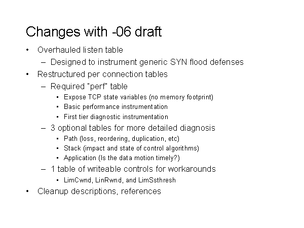 Changes with -06 draft Overhauled listen table Designed to instrument generic SYN flood defenses Restructured per connection tables Required “perf” table Expose TCP state variables (no memory footprint) Basic performance instrumentation First tier diagnostic instrumentation 3 optional tables for more detailed diagnosis Path (loss, reordering, duplication, etc) Stack (impact and state of control algorithms) Application (Is the data motion timely?) 1 table of writeable controls for workarounds LimCwnd, LinRwnd, and LimSsthresh Cleanup descriptions, references |