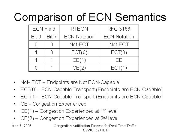Comparison of ECN Semantics Not- ECT – Endpoints are Not ECN-Capable ECT(0) - ECN-Capable Transport (Endpoints are ECN-Capable) ECT(1) - ECN-Capable Transport (Endpoints are ECN-Capable) CE - Congestion Experienced CE(1) – Congestion Experienced at 1st level CE(2) – Congestion Experienced at 2nd level |