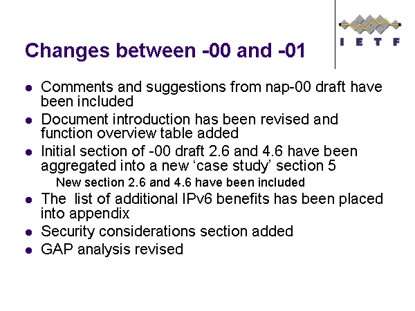 Changes between -00 and -01 Comments and suggestions from nap-00 draft have been included Document introduction has been revised and function overview table added Initial section of -00 draft 2.6 and 4.6 have been aggregated into a new ‘case study’ section 5 New section 2.6 and 4.6 have been included The list of additional IPv6 benefits has been placed into appendix Security considerations section added GAP analysis revised |