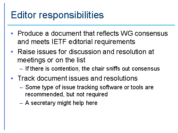 Editor responsibilities Produce a document that reflects WG consensus and meets IETF editorial requirements Raise issues for discussion and resolution at meetings or on the list If there is contention, the chair sniffs out consensus Track document issues and resolutions Some type of issue tracking software or tools are recommended, but not required A secretary might help here |