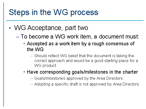 Steps in the WG process WG Acceptance, part two To become a WG work item, a document must: Accepted as a work item by a rough consensus of the WG Should reflect WG belief that the document is taking the correct approach and would be a good starting place for a WG product Have corresponding goals/milestones in the charter Goals/milestones approved by the Area Directors Adopting a specific draft is not approved by Area Directors |