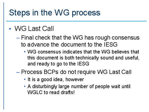 Steps in the WG process WG Last Call Final check that the WG has rough consensus to advance the document to the IESG WG consensus indicates that the WG believes that this document is both technically sound and useful, and ready to go to the IESG Process BCPs do not require WG Last Call It is a good idea, however A disturbingly large number of people wait until WGLC to read drafts! |