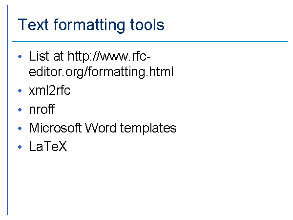 List at http://www.rfc-editor.org/formatting.html