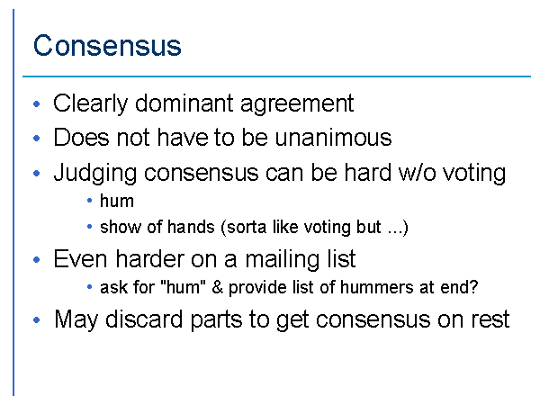 Consensus Clearly dominant agreement Does not have to be unanimous Judging consensus can be hard w/o voting hum show of hands (sorta like voting but ...) Even harder on a mailing list ask for "hum" & provide list of hummers at end? May discard parts to get consensus on rest |