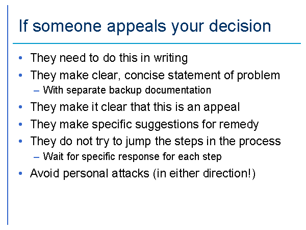 If someone appeals your decision They need to do this in writing They make clear, concise statement of problem With separate backup documentation They make it clear that this is an appeal They make specific suggestions for remedy They do not try to jump the steps in the process Wait for specific response for each step Avoid personal attacks (in either direction!) |