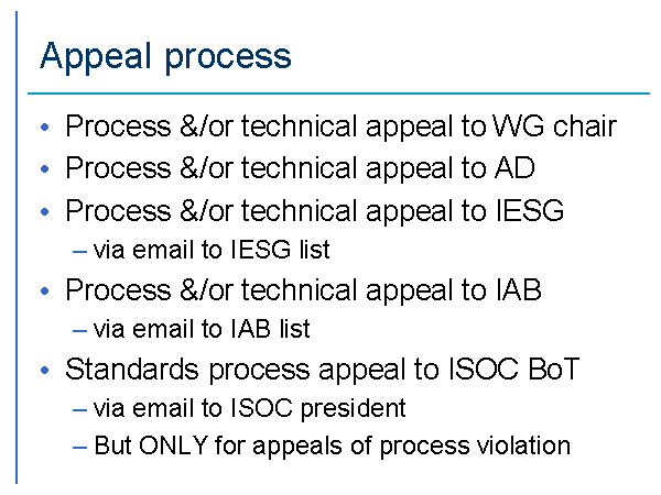 Appeal process Process &/or technical appeal to WG chair Process &/or technical appeal to AD Process &/or technical appeal to IESG via email to IESG list Process &/or technical appeal to IAB via email to IAB list Standards process appeal to ISOC BoT via email to ISOC president But ONLY for appeals of process violation |