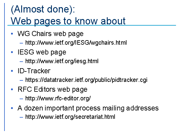 (Almost done): Web pages to know about WG Chairs web page http://www.ietf.org/IESG/wgchairs.html IESG web page http://www.ietf.org/iesg.html ID-Tracker https://datatracker.ietf.org/public/pidtracker.cgi RFC Editors web page http://www.rfc-editor.org/ A dozen important process mailing addresses http://www.ietf.org/secretariat.html |