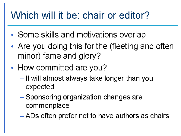 Which will it be: chair or editor? Some skills and motivations overlap Are you doing this for the (fleeting and often minor) fame and glory? How committed are you? It will almost always take longer than you expected Sponsoring organization changes are commonplace ADs often prefer not to have authors as chairs |