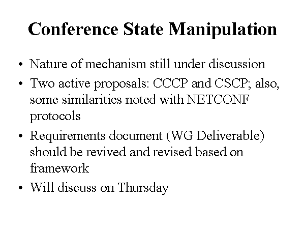Conference State Manipulation Nature of mechanism still under discussion Two active proposals: CCCP and CSCP; also, some similarities noted with NETCONF protocols Requirements document (WG Deliverable) should be revived and revised based on framework Will discuss on Thursday |