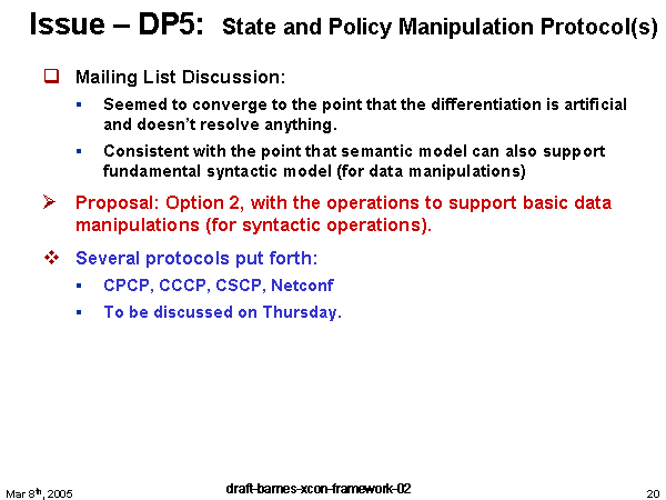 Issue – DP5: State and Policy Manipulation Protocol(s) Mailing List Discussion: Seemed to converge to the point that the differentiation is artificial and doesn’t resolve anything. Consistent with the point that semantic model can also support fundamental syntactic model (for data manipulations) Proposal: Option 2, with the operations to support basic data manipulations (for syntactic operations). Several protocols put forth: CPCP, CCCP, CSCP, Netconf To be discussed on Thursday. |