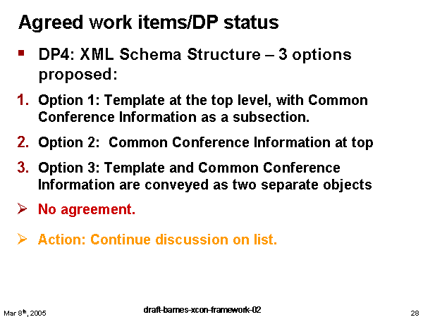 Agreed work items/DP status DP4: XML Schema Structure – 3 options proposed: Option 1: Template at the top level, with Common Conference Information as a subsection. Option 2: Common Conference Information at top Option 3: Template and Common Conference Information are conveyed as two separate objects No agreement. Action: Continue discussion on list. |