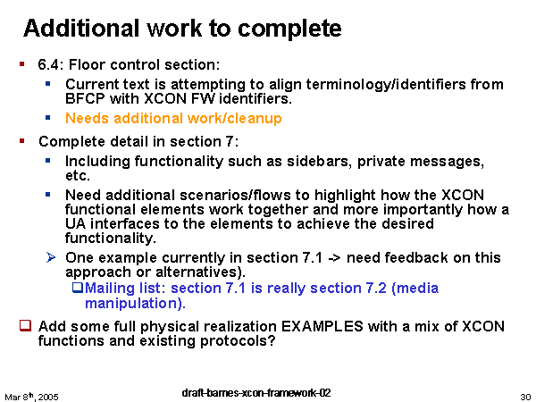 Additional work to complete 6.4: Floor control section: Current text is attempting to align terminology/identifiers from BFCP with XCON FW identifiers. Needs additional work/cleanup Complete detail in section 7: Including functionality such as sidebars, private messages, etc. Need additional scenarios/flows to highlight how the XCON functional elements work together and more importantly how a UA interfaces to the elements to achieve the desired functionality. One example currently in section 7.1 -> need feedback on this approach or alternatives). Mailing list: section 7.1 is really section 7.2 (media manipulation). Add some full physical realization EXAMPLES with a mix of XCON functions and existing protocols? |