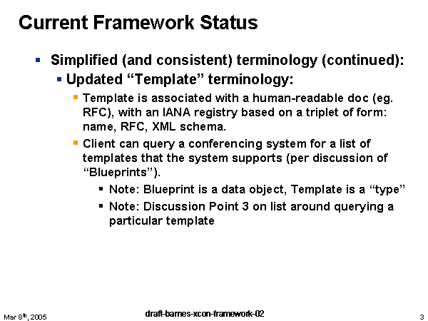 Current Framework Status Simplified (and consistent) terminology (continued): Updated “Template” terminology: Template is associated with a human-readable doc (eg. RFC), with an IANA registry based on a triplet of form: name, RFC, XML schema. Client can query a conferencing system for a list of templates that the system supports (per discussion of “Blueprints”). Note: Blueprint is a data object, Template is a “type” Note: Discussion Point 3 on list around querying a particular template |