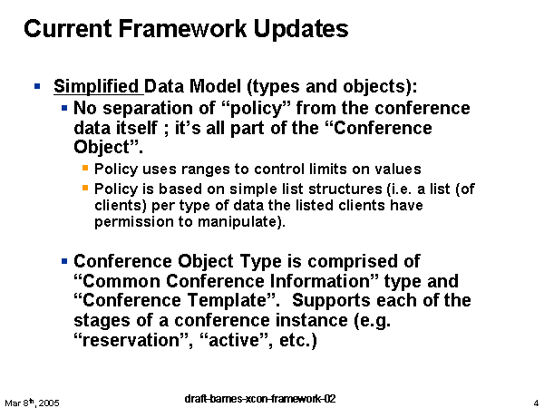 Current Framework Updates Simplified Data Model (types and objects): No separation of “policy” from the conference data itself ; it’s all part of the “Conference Object”. Policy uses ranges to control limits on values Policy is based on simple list structures (i.e. a list (of clients) per type of data the listed clients have permission to manipulate). Conference Object Type is comprised of “Common Conference Information” type and “Conference Template”. Supports each of the stages of a conference instance (e.g. “reservation”, “active”, etc.) |