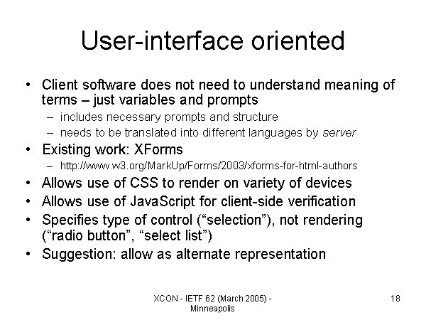 User-interface oriented Client software does not need to understand meaning of terms – just variables and prompts includes necessary prompts and structure needs to be translated into different languages by server Existing work: XForms http://www.w3.org/MarkUp/Forms/2003/xforms-for-html-authors Allows use of CSS to render on variety of devices Allows use of JavaScript for client-side verification Specifies type of control (“selection”), not rendering (“radio button”, “select list”) Suggestion: allow as alternate representation |