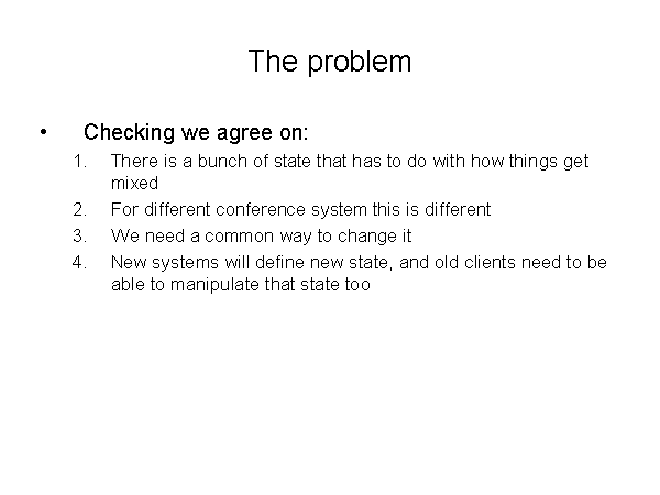 The problem Checking we agree on: There is a bunch of state that has to do with how things get mixed For different conference system this is different We need a common way to change it New systems will define new state, and old clients need to be able to manipulate that state too |
