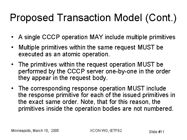 Proposed Transaction Model (Cont.) A single CCCP operation MAY include multiple primitives Multiple primitives within the same request MUST be executed as an atomic operation. The primitives within the request operation MUST be performed by the CCCP server one-by-one in the order they appear in the request body. The corresponding response operation MUST include the response primitive for each of the issued primitives in the exact same order. Note, that for this reason, the primitives inside the operation bodies are not numbered. |
