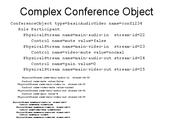 Complex Conference Object ConferenceObject type=basicAudioVideo name=conf1234 Role Participant PhysicalStream name=main-audio-in stream-id=22 Control name=mute value=false PhysicalStream name=main-video-in stream-id=23 Control name=video-mute value=normal PhysicalStream name=main-audio-out stream-id=24 Control name=gain value=0 PhysicalStream name=main-video-out stream-id=25 PhysicalStream name=main-audio-in stream-id=32 Control name=mute value=false PhysicalStream name=main-video-in stream-id=33 Control name=video-mute value=normal PhysicalStream name=main-audio-out stream-id=34 Control name=gain value=0 PhysicalStream name=main-video-out stream-id=35 PhysicalStream name=main-audio-in stream-id=42 Control name=mute value=false PhysicalStream name=main-video-in stream-id=43 Control name=video-mute value=normal PhysicalStream name=main-audio-out stream-id=44 Control name=gain value=0 PhysicalStream name=main-video-out stream-id=45 |